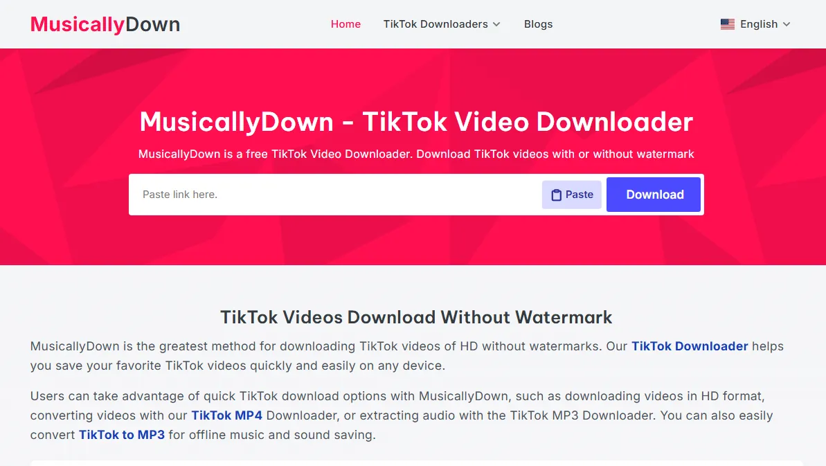 Users can take advantage of quick TikTok download options with MusicallyDown, such as downloading videos in HD format, converting videos with our TikTok MP4 Downloader, or extracting audio with the TikTok MP3 Downloader. You can also easily convert TikTok to MP3 for offline music and sound saving.